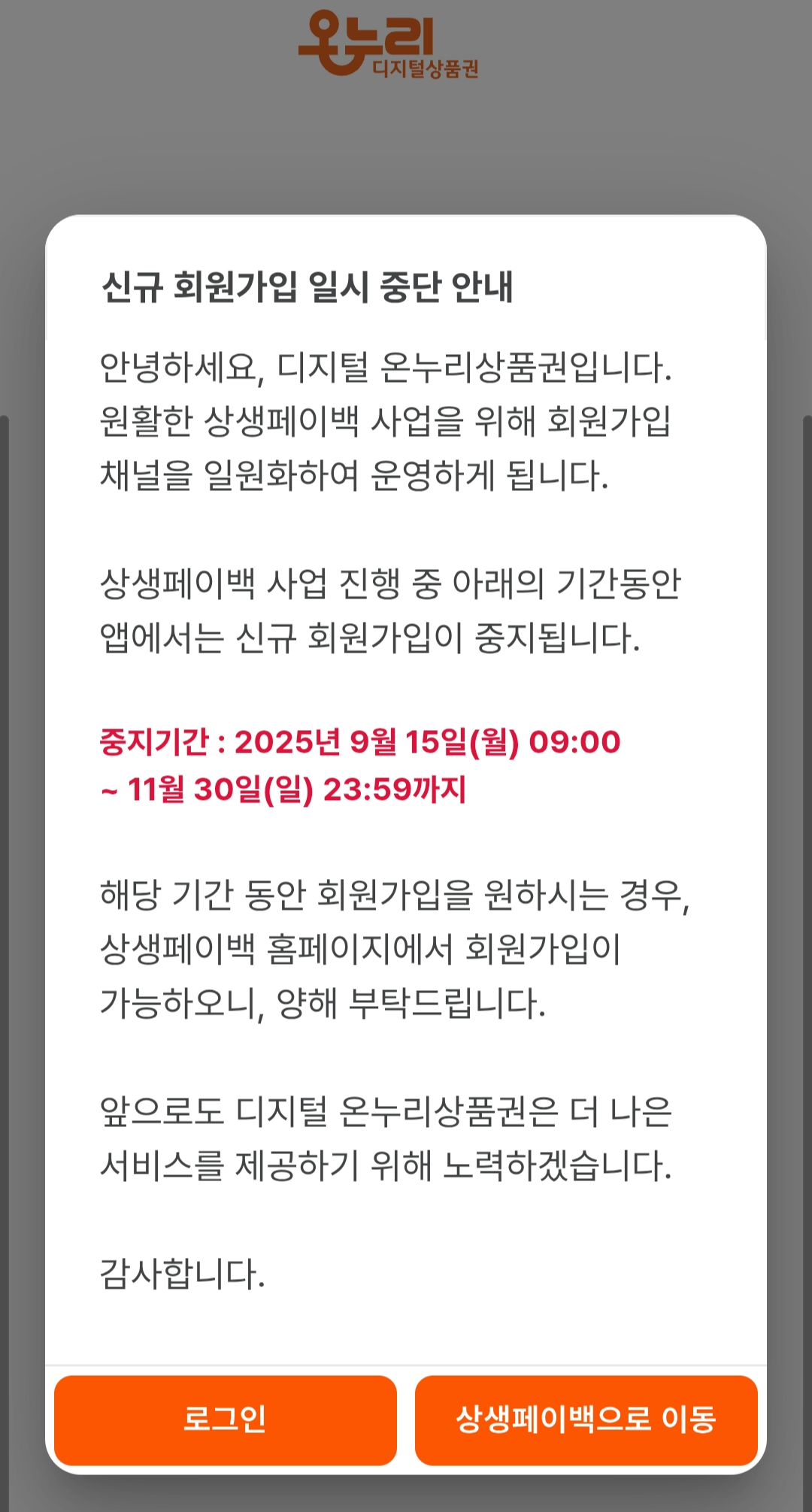 하지만 2025년 9월 15일부터 회원가입 일원화를 위해 상생페이백 홈페이지에서 디지털 온누리 상품권 회원가입이 가능하다고 합니다. 저처럼 헤매지 마세요!(링크 첨부합니다!) 출생연도별 신청일이 다르니 참고하세요! 여기서 회원가입하세요!